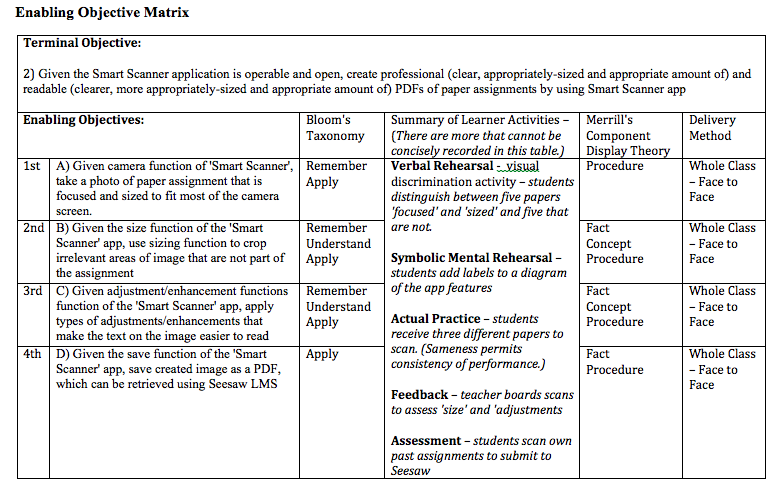 This project sought to provide instruction on how to use 'TapScanner' app to create PDFs by using an iPad Camera. The aim of instruction was improve students' electronic creation of paper assignments. These assignments would then be submitted to a Learning Management System by using an external photo application. The students are young learners in Grade 4. By mastering this skill, students should be able to provide backup of lost assignments, provide their parents with readable assignments submitted, provide the teacher with the ability to assess digitally and provide the administration with a convenient way to review the students' work. This instruction will be delivered face-to-face; however, the main instructional message will be delivered digitally in video.